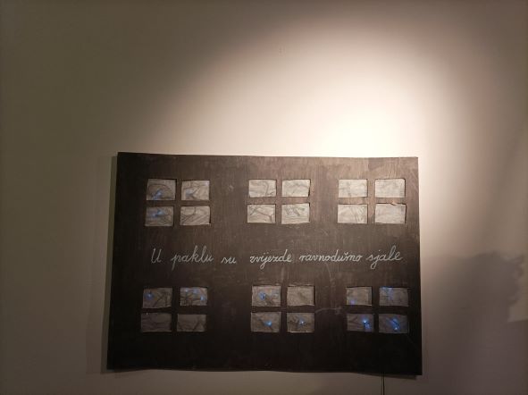 crno-bijeloj boji u kombiniranoj tehnici tempere, kolaža i assemblagea te svjetlosnu