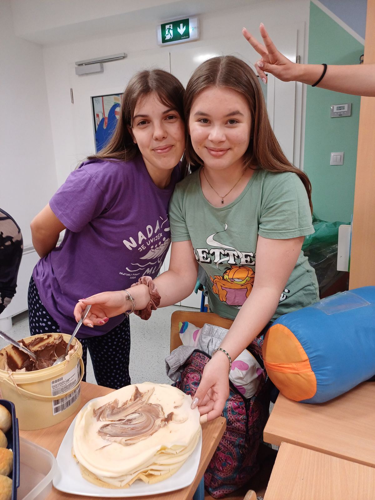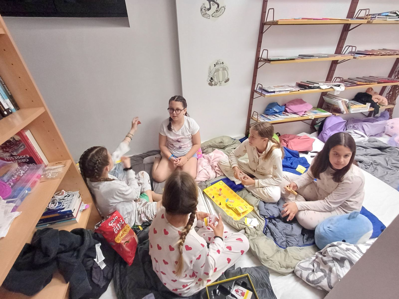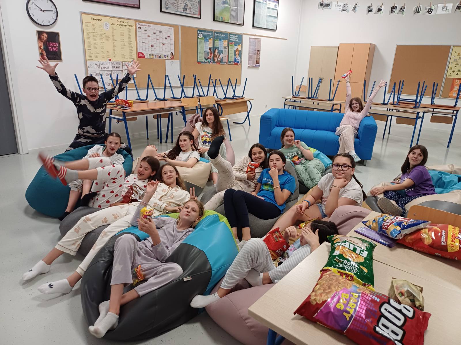 Okupili smo se u petak pred školskom knjižnicom u 19h. Bilo je užurbano dok smo među policama knjiga pripremali nadmadrace i vreće za spavanje. Zatim smo zasluženo odmorili uz večeru.