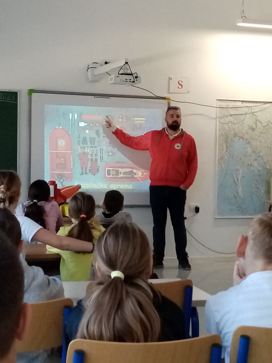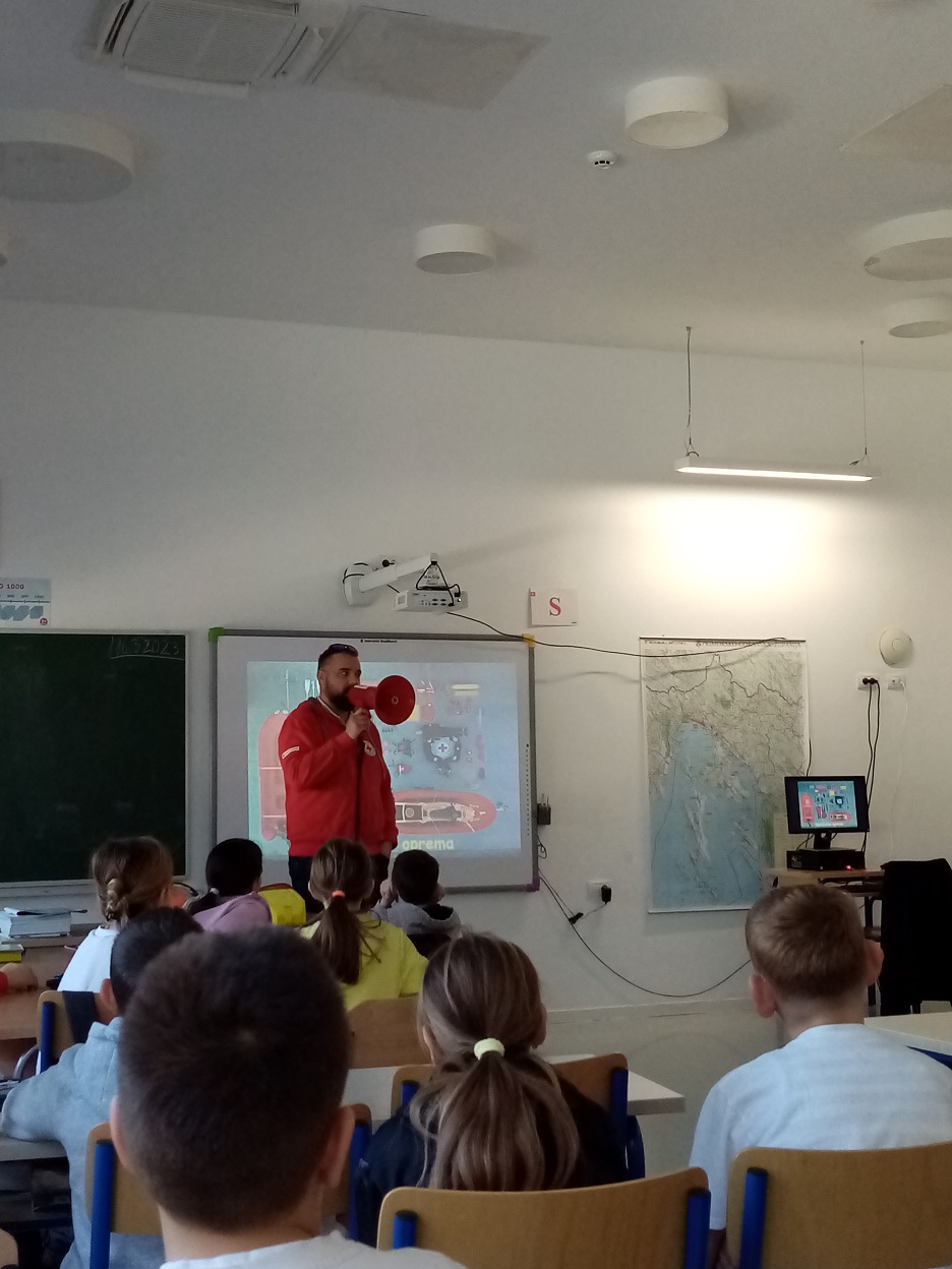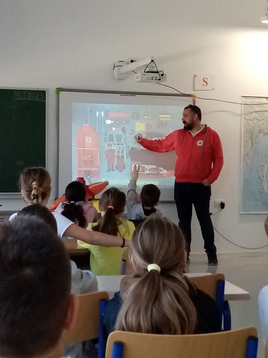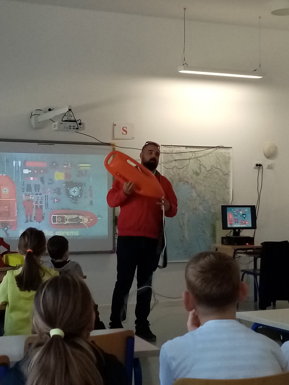 Ivan Uravić, koordinator spasilačke službe upoznao je učenike s aktivnostima spasilačke službe na vodi i potencijalnim opasnostima. U interesantnom  predavanju upozorio je na kodeks sigurnosti na vodi. Učenicima je opisao znak spasilačke službe te radnu odjeću i opremu spasioca. U zadnjem dijelu predavanja prikazao je sadržaj torbe prve pomoći i metode osnovnog oživljavanja. Djeci je bila najzanimljivija praktična primjena opreme. Gospodin Uravić je na kraju odgovarao na brojna pitanja zainteresiranih učenika.