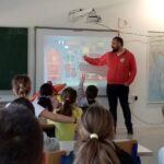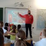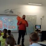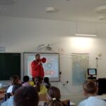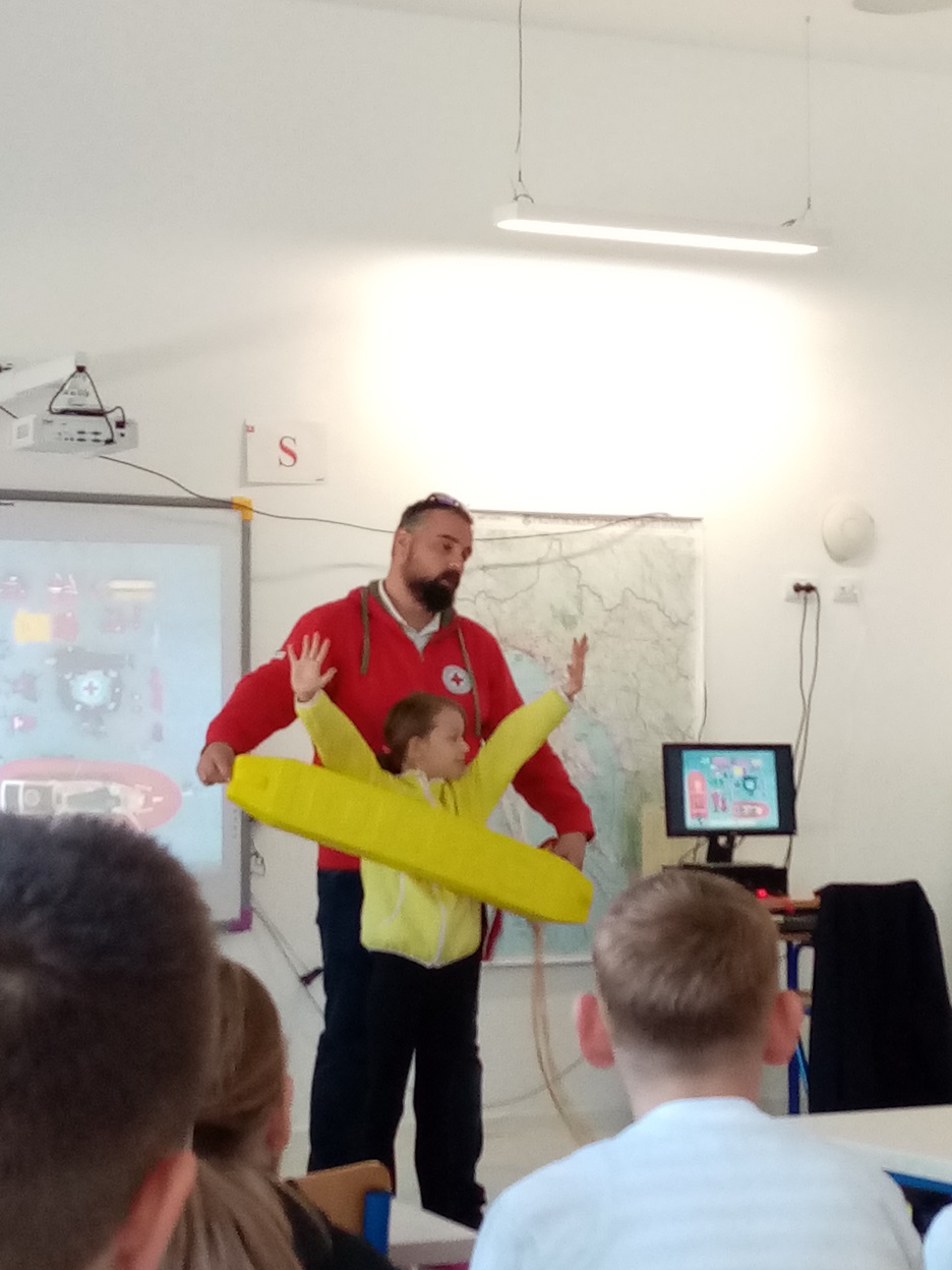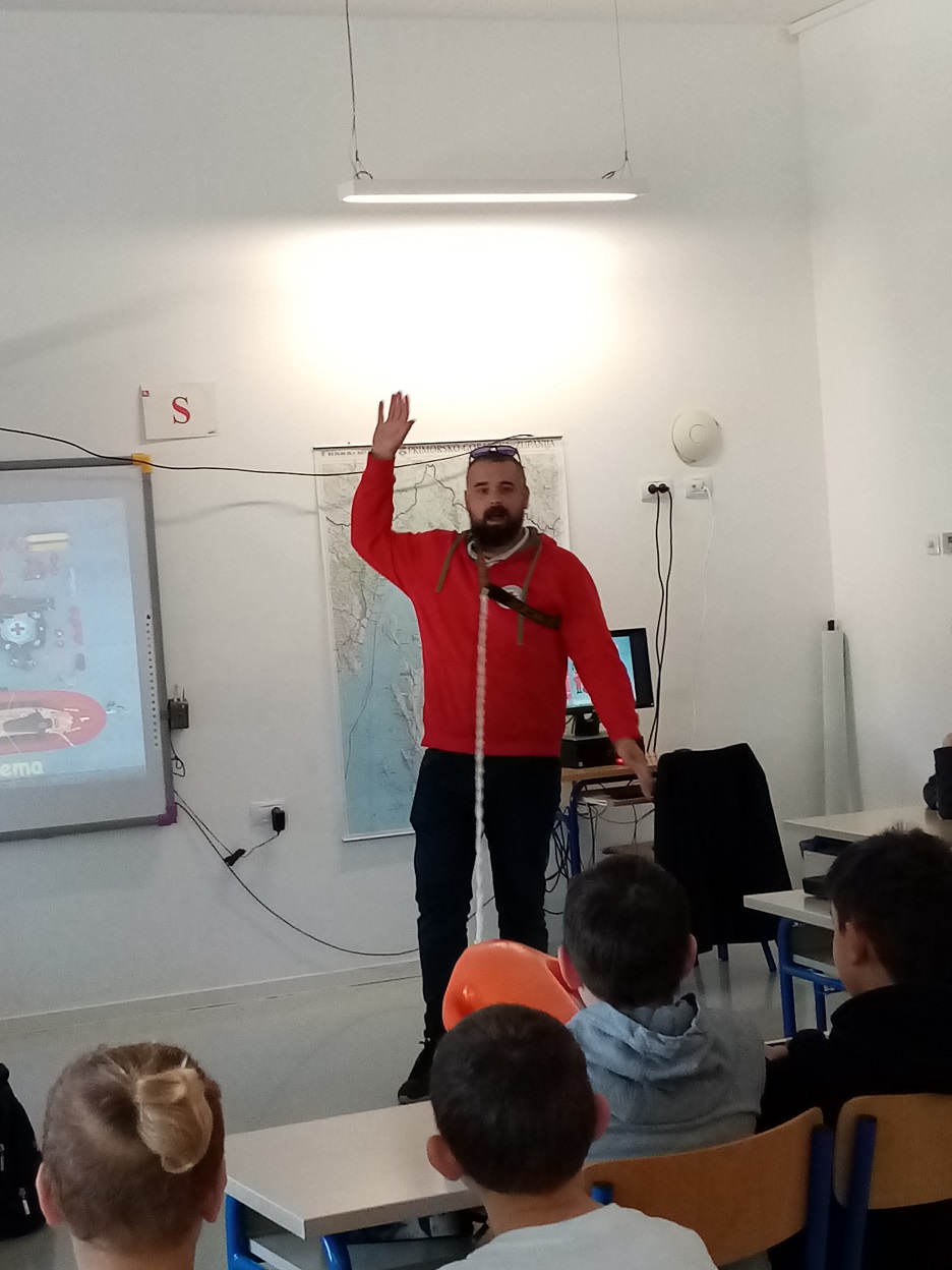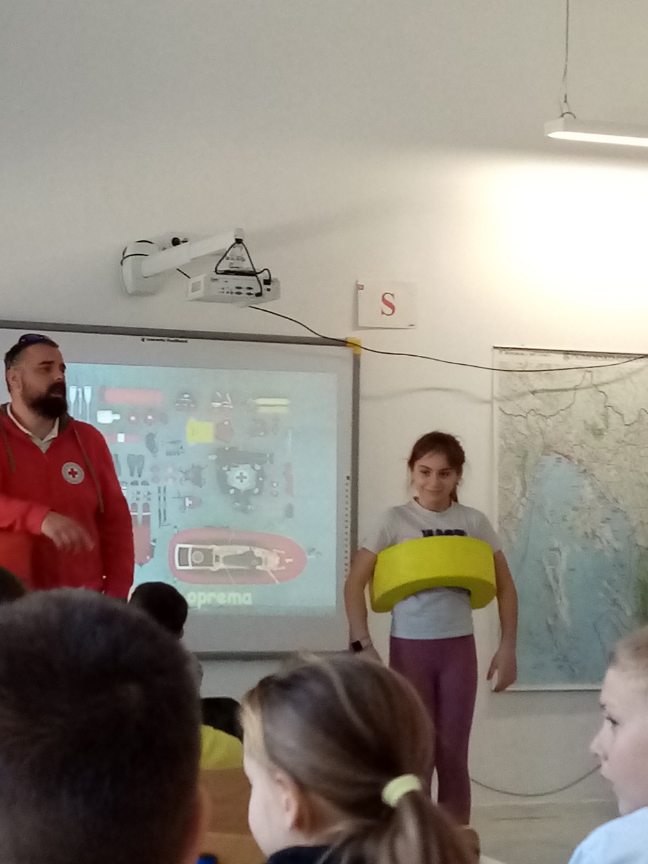 Ivan Uravić, koordinator spasilačke službe upoznao je učenike s aktivnostima spasilačke službe na vodi i potencijalnim opasnostima. U interesantnom  predavanju upozorio je na kodeks sigurnosti na vodi. Učenicima je opisao znak spasilačke službe te radnu odjeću i opremu spasioca. U zadnjem dijelu predavanja prikazao je sadržaj torbe prve pomoći i metode osnovnog oživljavanja. Djeci je bila najzanimljivija praktična primjena opreme. Gospodin Uravić je na kraju odgovarao na brojna pitanja zainteresiranih učenika.