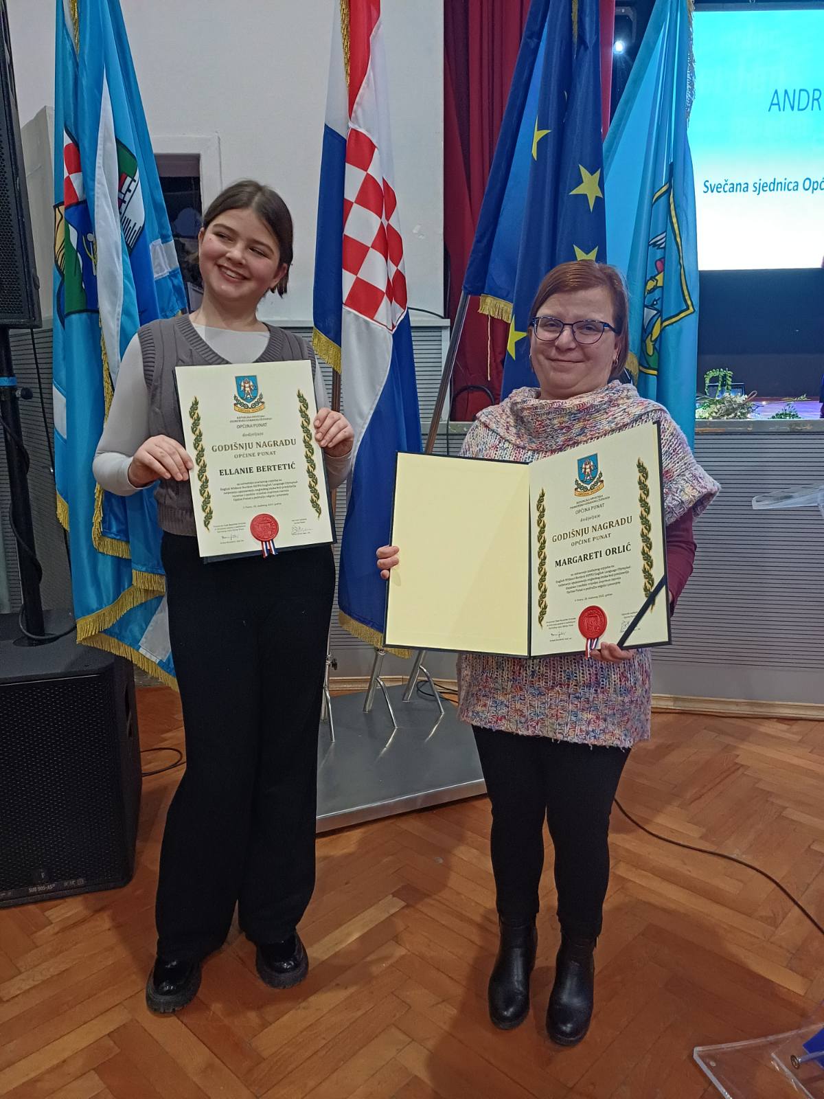 Popodne je proteklo u svečanijem tonu na Svečanoj sjednici Općine Punat, gdje su dodijeljena priznanja za 2024. i 2025. godinu. S ponosom ističemo da je naša učenica petog razreda Ellanie Bertetić, zajedno sa svojom mentoricom Margaretom Orlić, primila Godišnju nagradu Općine Punat. Priznanje je dodijeljeno zbog iznimnog uspjeha postignutog na Hippo jezičnoj olimpijadi iz engleskog jezika u 2024. godini, što predstavlja veliki ponos za našu školu i potvrdu predanog rada i znanja.