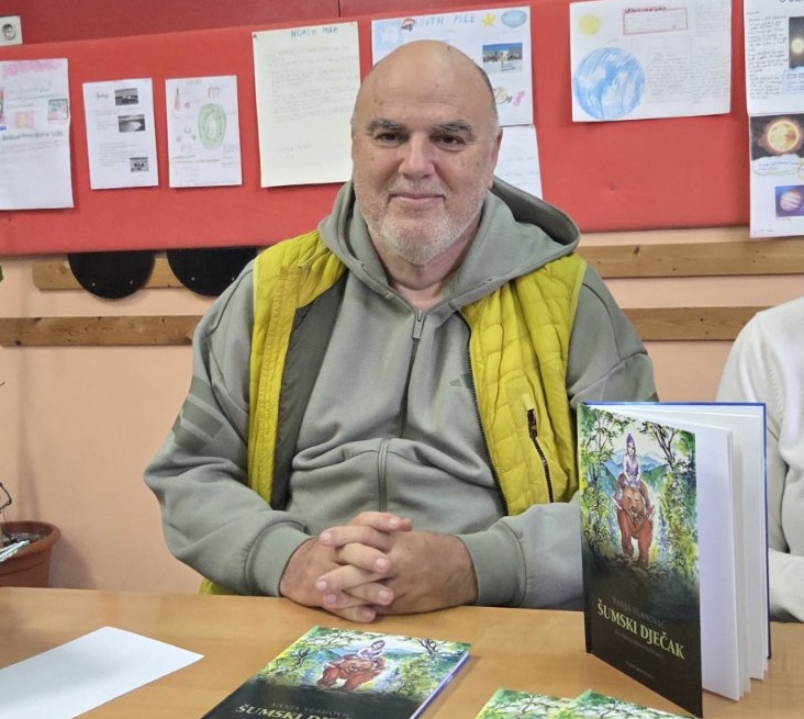 U srijedu 11. ožujka 2026. u našoj školi ugostili smo pisca i pjesnika Vanju Vlahovića iz Omiša, čiju smo knjigu „Šumski dječak“ čitali na satovima glazbene kulture. Pisca smo dočekali pjesmom, naša vokalna skupina Škrletin izvela je pjesme Vrbniče nad morem i Naranča. Knjižničarka Irena upoznala ga je i s našom školskom knjižnicom, a posebno ga je razveselilo što se u njoj nalazi i njegova knjiga.