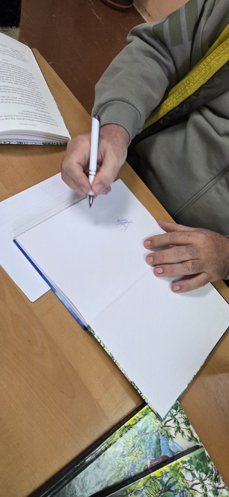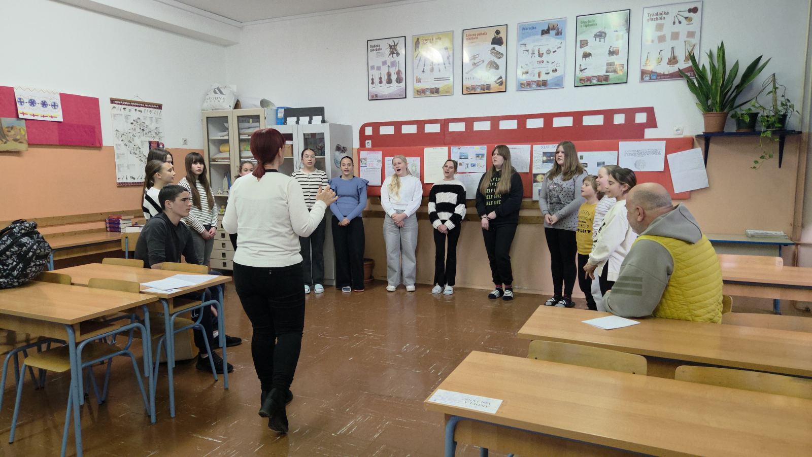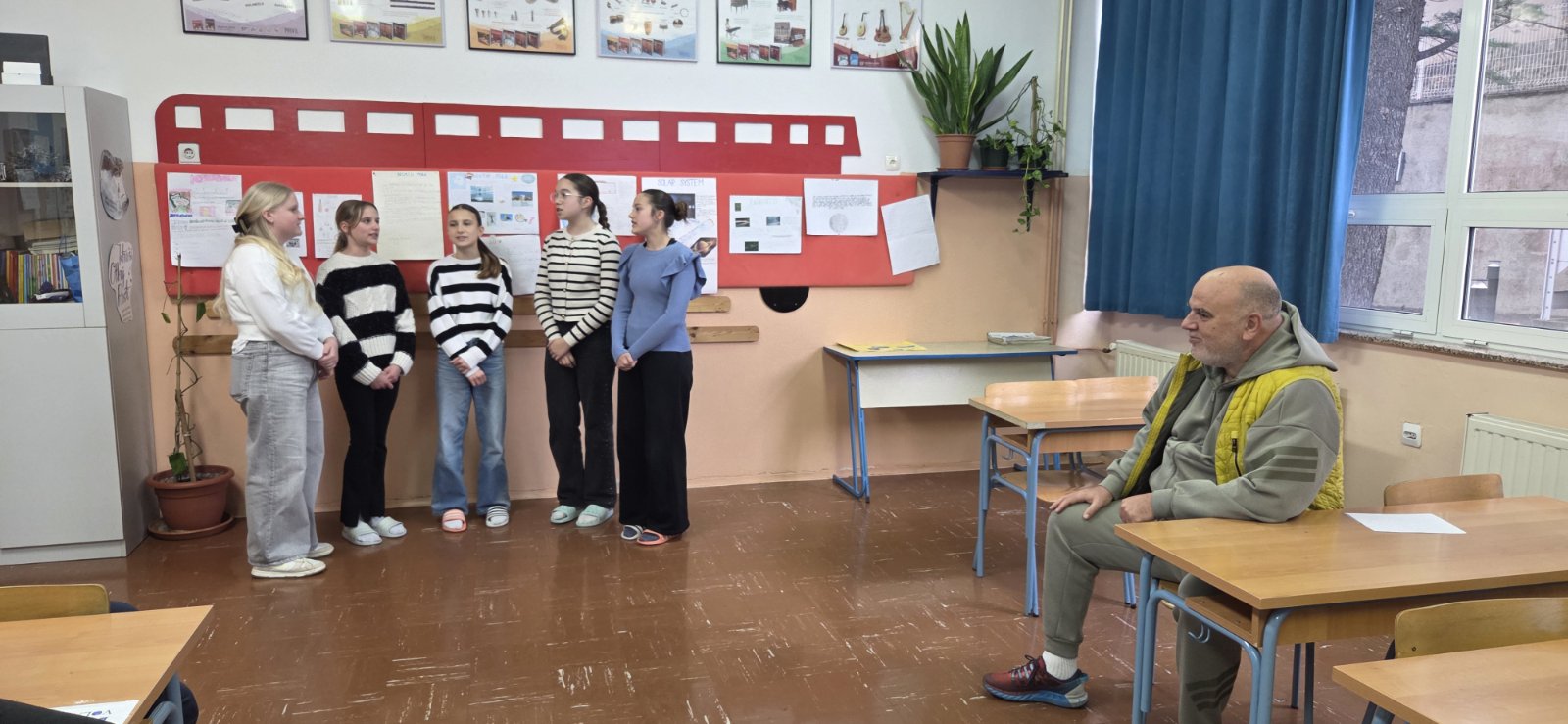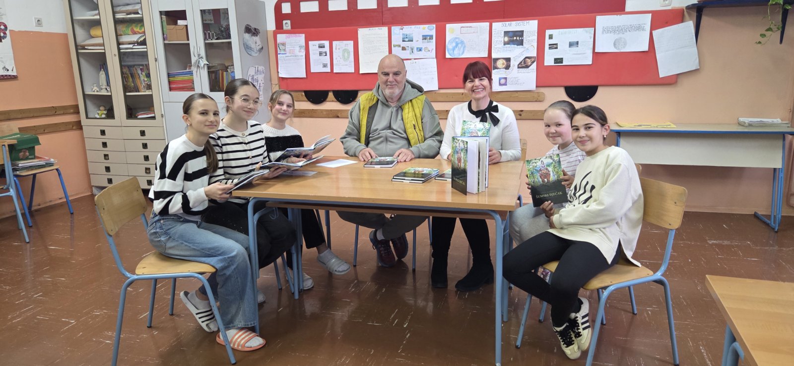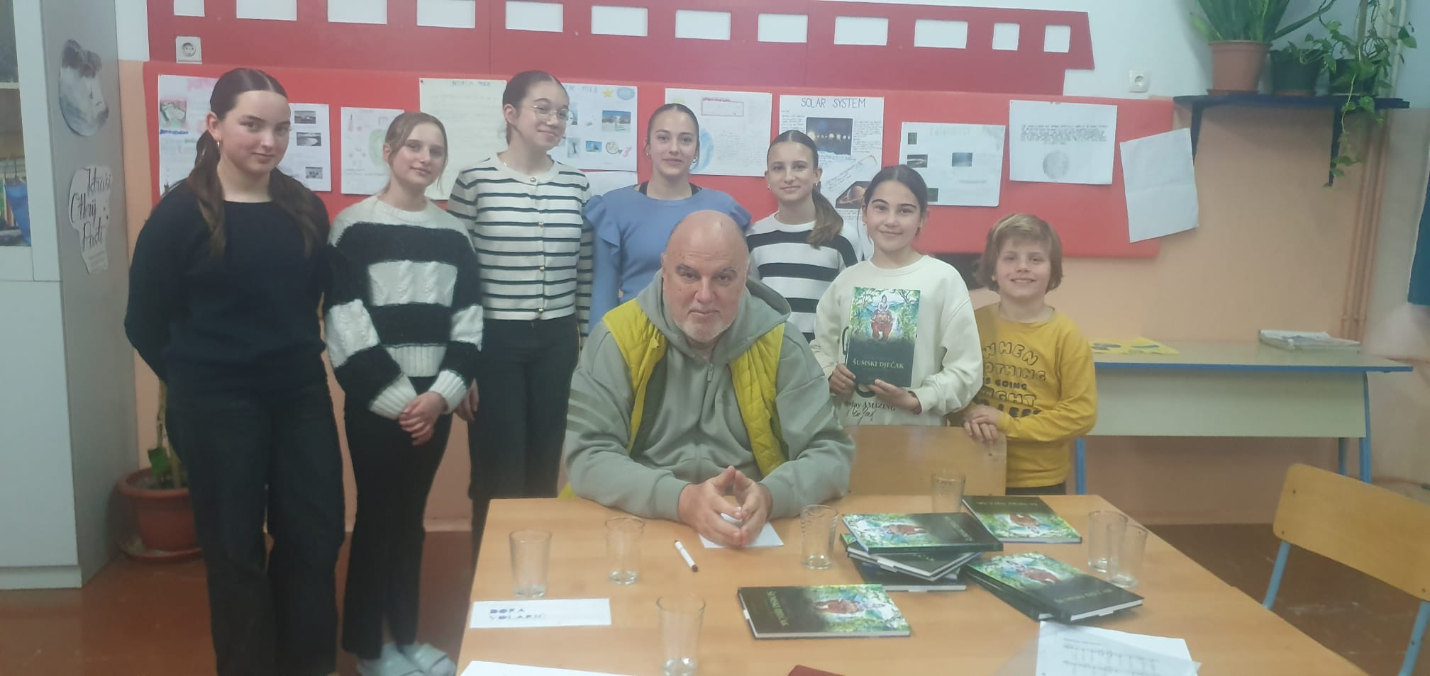 U srijedu 11. ožujka 2026. u našoj školi ugostili smo pisca i pjesnika Vanju Vlahovića iz Omiša, čiju smo knjigu „Šumski dječak“ čitali na satovima glazbene kulture. Pisca smo dočekali pjesmom, naša vokalna skupina Škrletin izvela je pjesme Vrbniče nad morem i Naranča. Knjižničarka Irena upoznala ga je i s našom školskom knjižnicom, a posebno ga je razveselilo što se u njoj nalazi i njegova knjiga.
