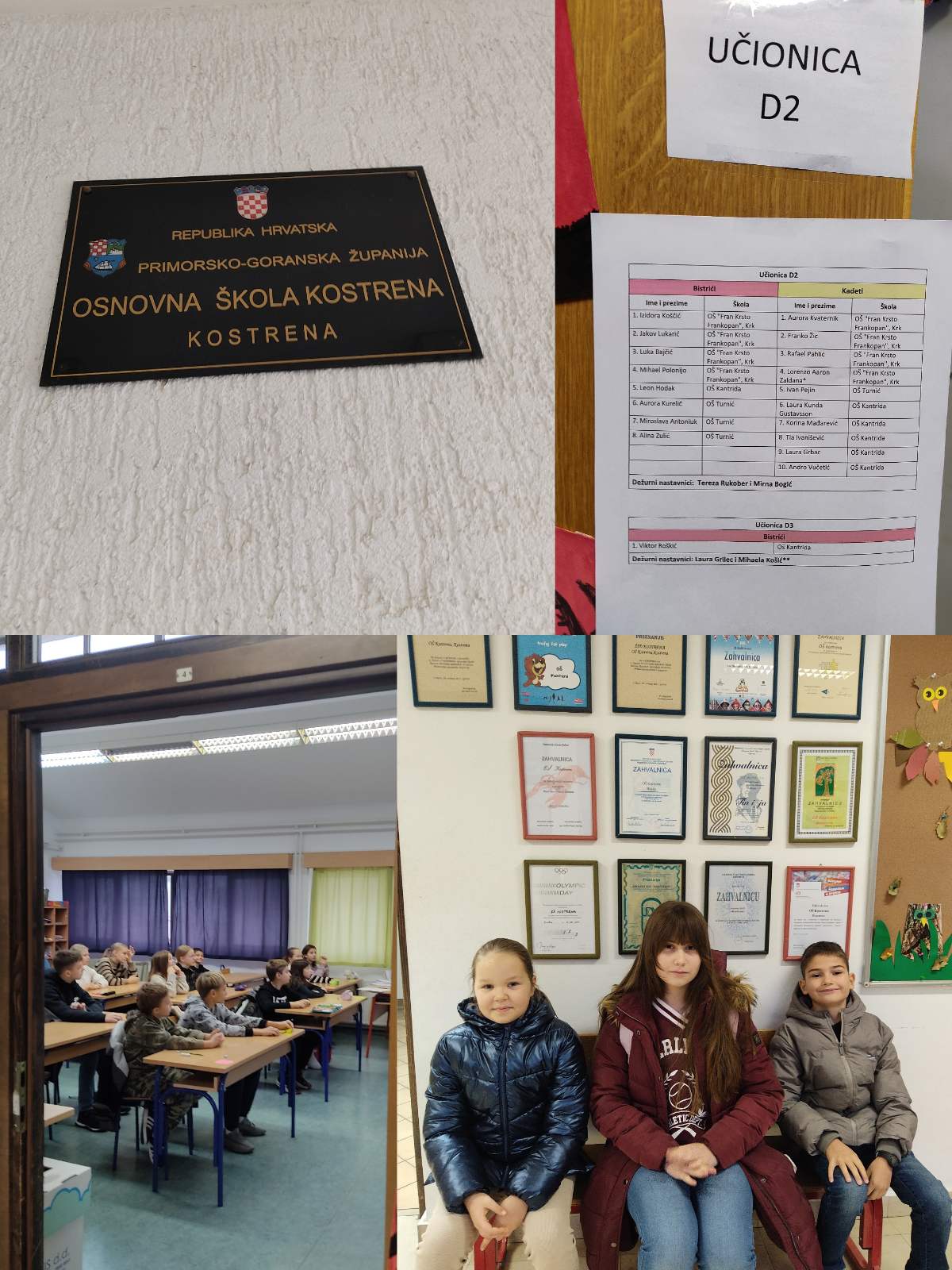 Toga dana 22. 11. kad se održavalo regionalno natjecanje u OŠ Kostrena u čitavom Primorju puhala je jaka bura, a u drugim dijelovima Hrvatske je padao snijeg. Krenula sam s roditeljima rano u jutro i baš negdje oko mosta, svega par metara ispred našeg automobila vjetar je prevrnuo prikolicu i nakratko obustavio promet. Jako sam se uplašila. Srećom nitko od nas nije bio ozlijeđen. Došla sam u Kostrenu još pod dojmom te prometne nezgode, ali trebalo se sabrati i započeti s natjecanjem. Učiteljica Kristina vodila je Izidoru i Jakova pa nas je skupila, slikala i hrabrila, a mi smo odlučili dati sve od sebe. Regionalni dio bio je nešto drugačiji zbog dodatnih bodova koje bi učenici skupljali ako su tablice riješili brže od predviđenog vremena. Iako nisam zadovoljna konačnim rezultatom, na kraju dana bilo mi je najvažnije da smo se dobro zabavili i da smo nakon nekoliko sati čekanja ipak uspjeli prijeći most i vratiti se na naš otok. Čestitam svim sudionicima i nadam se da se opet vidimo na nekom sljedećem natjecanju.