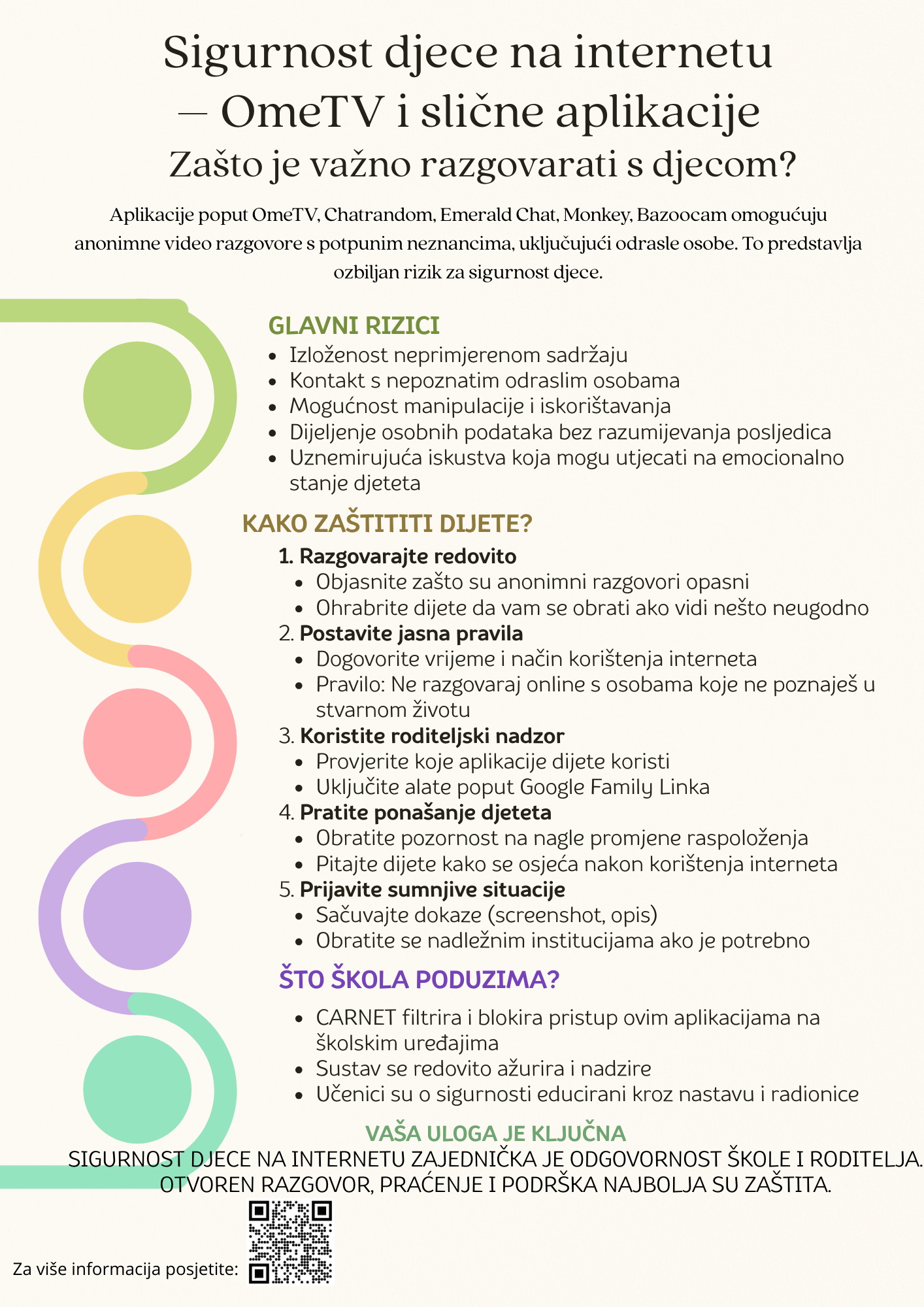 Ipak, učenici internetu pristupaju i izvan škole — kod kuće ili putem mobilnih podatkovnih mreža na osobnim uređajima. Zbog toga preporučujemo da razgovarate s djecom o rizicima korištenja ovakvih aplikacija te ih potaknete na sigurno i odgovorno ponašanje na internetu.