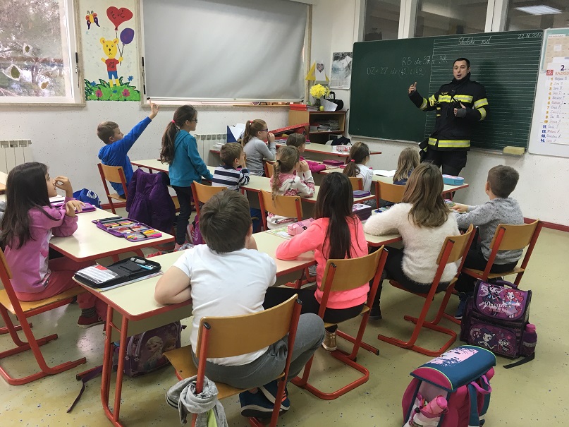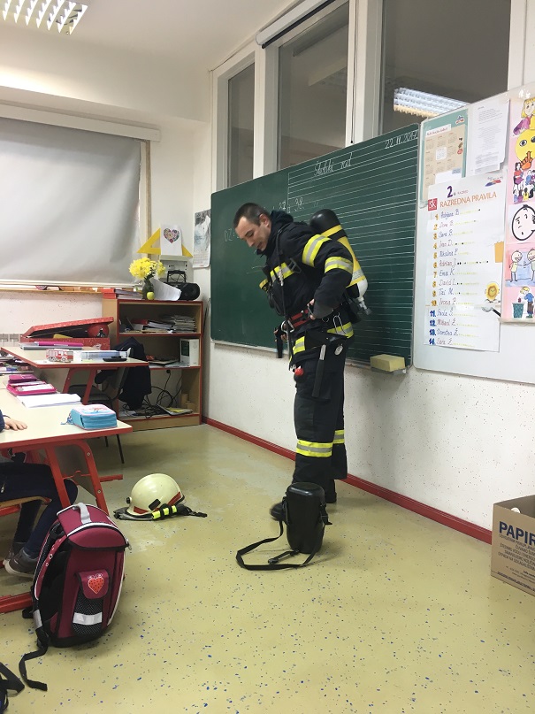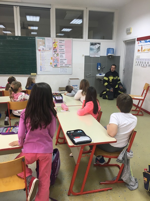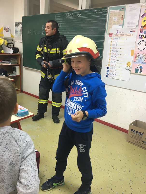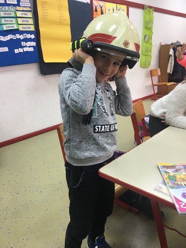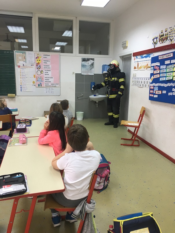 Nakon dočeka, vatrogasac Goran se predstavio učenicima te je zatim vrlo zanimljivom i poučnom prezentacijom pomno prikazao rad vatrogasaca, opremu i vatrogasno odijelo kojim se služe u slučaju požara te što je bitno učiniti kada želimo pozvati vatrogasce u pomoć. Uz to, učenici su mu imali priliku postavljati pitanja, a na koja im je naš gost sa zadovoljstvom odgovarao. Pri kraju nastavnoga sata, uz pomoć vatrogasca Gorana, svi učenici su mogli nakratko isprobati vatrogasno odijelo što ih je jako veselilo.