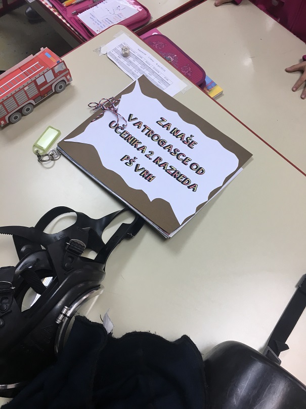 I za kraj, uručili smo našem gostu zajednički poklon u obliku blok crteža s motivima vatrogasaca i vatrogasnih kola koje su učenici prethodno pripremili kao uspomenu i znak zahvalnosti svim krčkim vatrogascima.