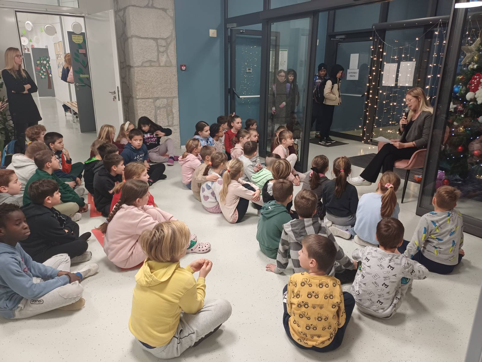 Tako smo se od prošlog ponedjeljka, 15. prosinca 2025. počeli okupljati nakon prvog zvona i u blagdanskom ozračju našeg hola slušali smo božićne priče koje su čitale učiteljice Matea i Martina.